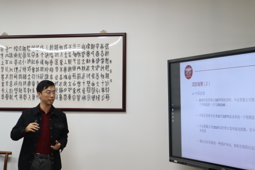 黄勉老师对“中国市场波动指数项目”进行了展示。该项目通过设计一套科学可靠、简单稳健的指数,更加客观地反映市场情况、避免短期大幅震荡。该项目预期在市场风险度量、风险工具等方向开展科学研究,在各种期权市场和需求层面开展业务合作;同时通过指导学生参与项目、开展案例建设,服务学院人才培养和学科建设。