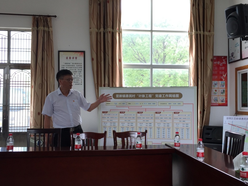 在座谈会上,惠民村党支部书记、村委会主任施诚首先向大家介绍了惠民村如何以党建促发展,努力实现乡村振兴。近年来,惠民村一直秉承“惠风和畅、民勤年丰”的理念,改善生态环境,提高生活质量,提升文明素质,构建和谐社区,逐步建立新型美丽乡村,连续多年获得“崇明县生态文明村”、“上海市文明村”等荣誉称号。这些成绩的取得离不开惠民村在党建工作上创新推行的“叶脉工程”。惠民村党支部共有110位党员,五个党小组形成五个不同的网格,每一个网格在划分成管理、工作和志愿三支团队。这层层的“叶脉的纹路”便象征着惠民村的党建小组划分成不同的层级,各层级之间由上至下有条不紊地形成一套高效的管理体系。
