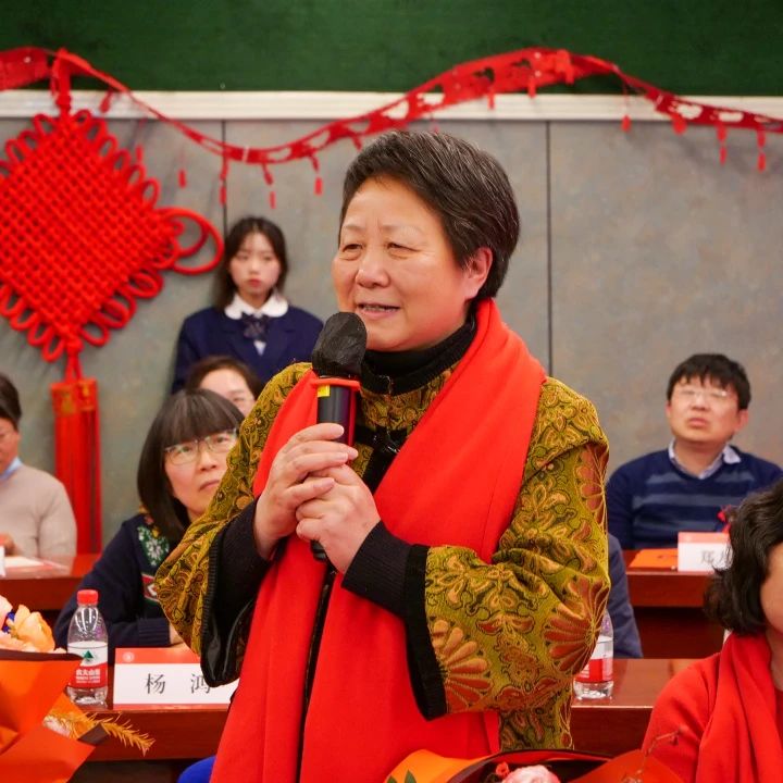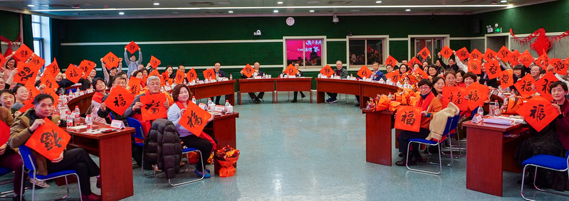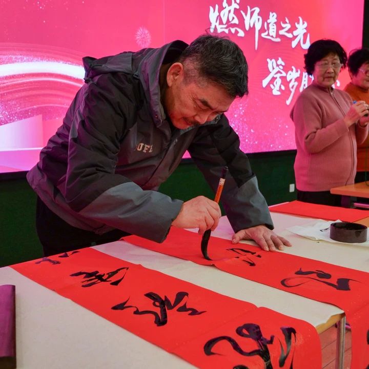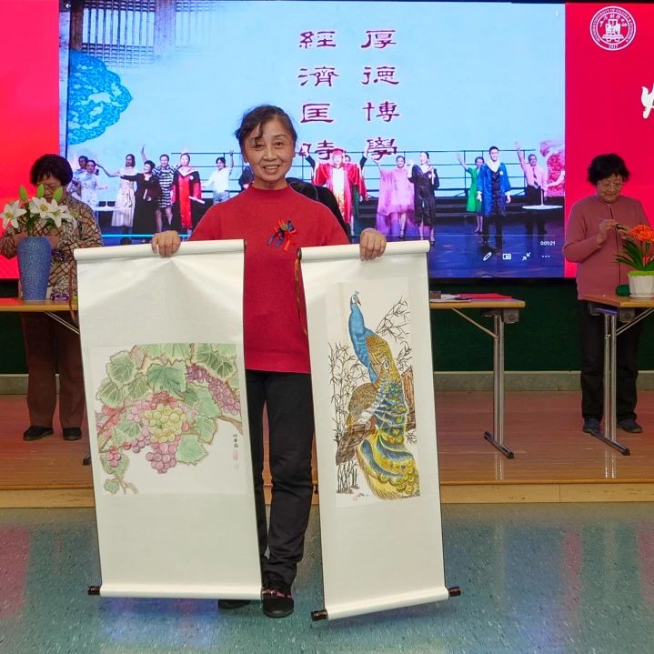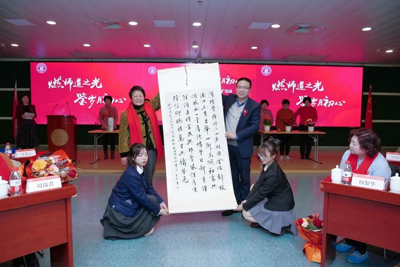 离退休老同志精心准备了精彩纷呈的《泼墨挥毫·新春祝福》节目,通过绘画、书法、旗袍秀、诗朗诵、手工编织等现场才艺表演,展现离退休后丰富多彩的生活。离退休老同志代表林珏老师和应勤俭老师为大家带来中国画和书法作品展示。2023年荣休教职工代表王玲老师将手书的书法作品——校歌《共铸荣光》赠送学校,徐飞常务副校长代表学校接受祝福。