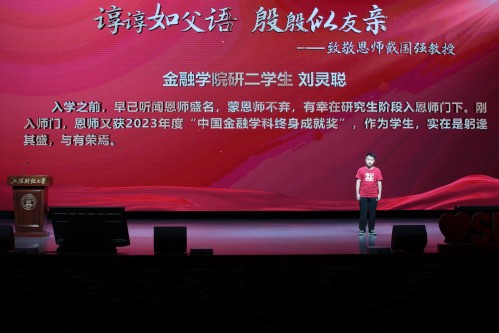 为展示新时代教育家精神在上财的传承和弘扬,国家级教学名师戴国强教授、99级金融博士孙奉军校友、金融学院研二刘灵聪同学共同献上了一堂别开生面的情景讲述。“谆谆如父语,殷殷似友亲”,师道传承间,尽显上财人“厚德博学,经济匡时”的精神和“一切为着建设祖国”的底色。