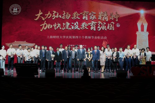 桃李芬芳,教泽绵长,在我国第40个教师节来临之际,为弘扬教育家精神,加强新时代高素质专业化教师队伍建设,进一步营造全校上下尊师重教的浓厚氛围,团结凝聚全体上财教师以更加奋发有为的精神状态投身教育强国建设实践,9月10日,上海财经大学隆重举办了以“大力弘扬教育家精神 ,加快建设教育强国”为主题的教师节表彰活动。