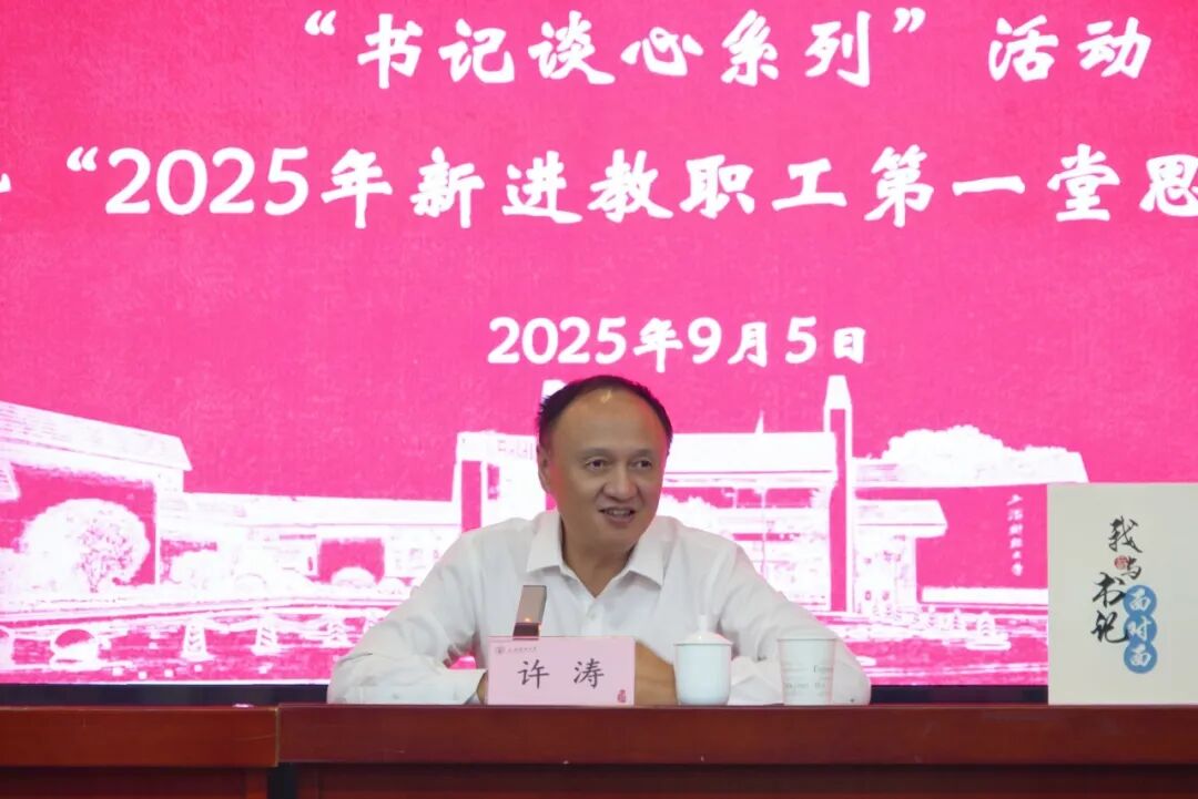 为深入弘扬教育家精神,推动新时代高素质专业化教师队伍建设,进一步营造尊师重教的良好氛围,9月5日下午,学校举行了“上财欢迎您”暨“我与书记面对面”活动。校党委书记许涛为2025年新入职教职工讲授了第一堂思政课。活动由党委教师工作部部长、人才工作办公室主任张喆主持。
